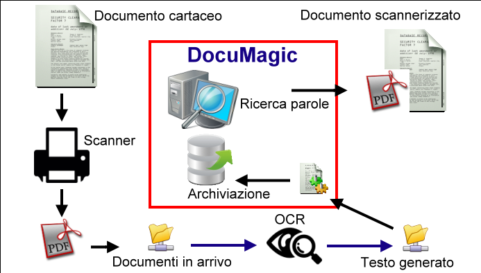 DocuMagic lavora in stretta simbiosi con il più avanzato motore di Riconoscimento Ottico dei caratteri, che si incarica di leggerli come farebbe un essere umano, e provvede ad analizzare il contenuto dei documenti e archiviarli in base al loro contenuto. Il sofisticato motore di ricerca testuale di DocuMagic permette a questo punto di trovare un documento tra centinaia di migliaia in una frazione di secondo, visualizzarlo, stamparlo, inviarlo ecc.